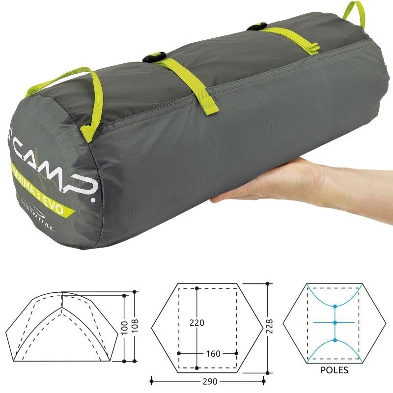 En concevant la tente Minima 3 EVO, la marque Camp n’a rien oublié : l’aération, l’imperméabilité ou la stabilité et l’habitabilité, la compacité ou la fiabilité, aucun aspect n’a été négligé. La zone de couchage (la chambre) peut accueillir aisément 3 personnes avec une largeur de 160 cm, une longueur 220 cm et une hauteur maximale de 100 cm. Quant au matériel de trekking ou de bivouac, on peut l’entreposer dans les 2 absides à disposition de chaque côté de la tente. À l’intérieur de la tente Minima 3 EVO Camp, on trouve aussi un emplacement pour accrocher une lampe et plusieurs poches de rangement. Quand il s’agit de repartir et de plier bagage, votre tente Minima se range facilement et rapidement dans sa housse avec un volume plié appréciable et un poids très correct : 50 x 18 cm et 2530 grammes sur la balance. Du fait des matériaux employés dans la construction des tentes Camp Minima 3 EVO, on a une longévité considérable : arceaux en aluminium 7001 robuste, tapis en nylon 70 deniers et toit en nylon Ripstop 30 deniers.