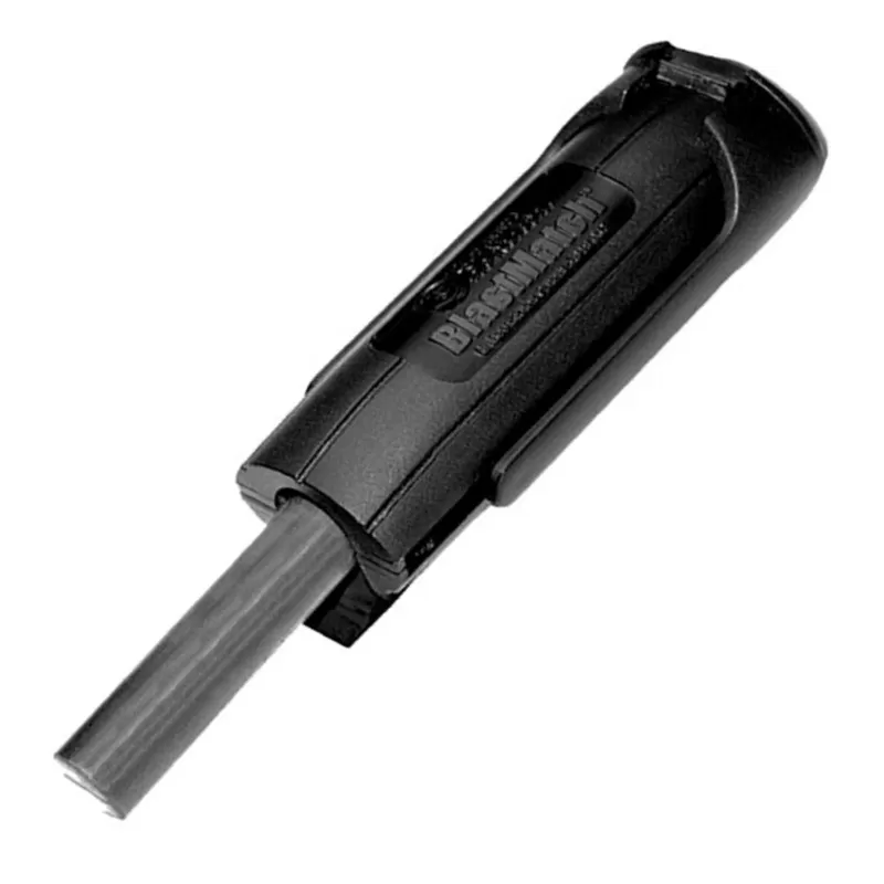 Quasiment inusable, la pierre à feu Blastmatch possède une autonomie de 4000 coups soit 4000 jets d’étincelles à plus de 3000°C (soit plus de chaleur qu’une allumette standard) : démarrez plus de 1000 feux dans des conditions faciles ou difficiles de survie. La Blastmatch se manipule d’une seule main (le grattoir est intégré dans le manche) et c’est là son grand intérêt. Utilisez votre pierre à feu même avec une main blessée. De plus, son volume rangé est très intéressant puisqu’elle ne mesure que 102 mm de long (et 35 mm de large) dès qu’on ne l’actionne pas. Son poids est proche d’une pierre à feu ferrocérium classique : 65 grammes. Coloris : noir.