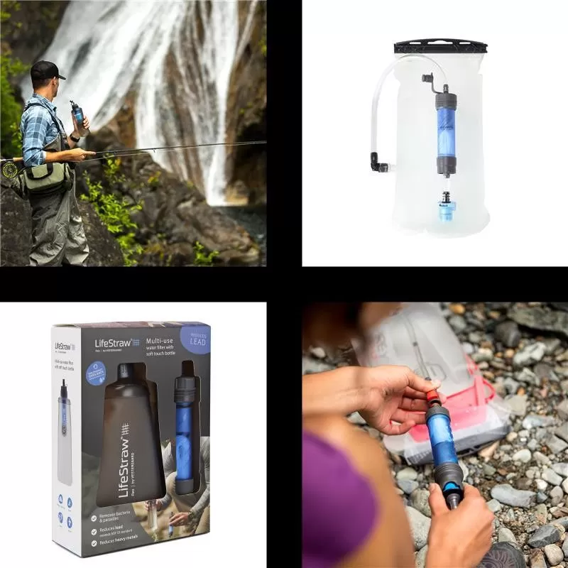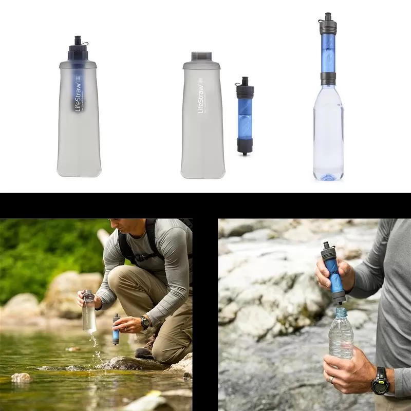 Le système Lifestraw Flex Basic est ingénieux et performant. D’un côté, on a une gourde souple et pliable : vous l’entreposez facilement dans votre sac à dos. Elle est ultra légère et elle a une contenance de 0,65 litre. D’un autre côté, on a un filtre de type paille filtrante : c’est un filtre à eau avec lequel on peut boire directement l’eau de n’importe quelle provenance (sauf eau de mer). Et cette paille Lifestraw peut s’utiliser seule ou avec la gourde Lifestraw (on l’installe alors à l’intérieur de la gourde). Elle peut également être connectée au tube de votre poche à eau. On peut aussi l’utiliser avec une bouteille d’eau classique (il suffit de la connecter au goulot de la bouteille). En résumé, on tient là un système d’hydratation et de filtration extrêmement polyvalent. Ce système est particulièrement indiqué pour de la randonnée, du trekking et de la survie.